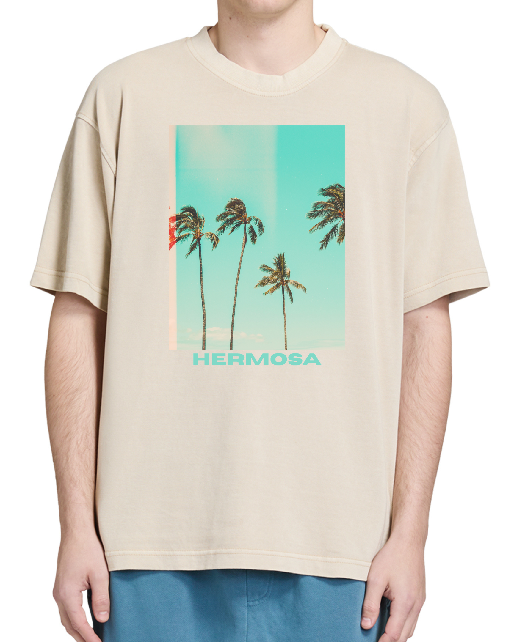THE TOBY HERMOSA is a classic vintage 100% cotton jersey crew neck drop shoulder unisex teeshirt with the classic SOCAL palm tree print.